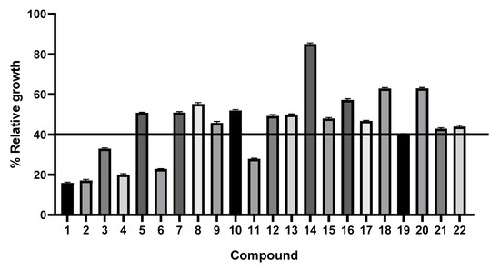 All the compounds (1–22) were screened for their cytotoxic activity in the glioblastoma cell line. The results obtained from the bioassay are summarized in Figure 3. Those with a percentage of relative growth (%RG) of 40% or less, with some specific exceptions for SAR structure–activity analysis, were selected to determine IC50 values.