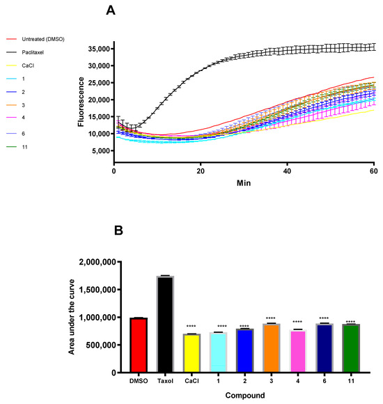 (A) Tubulin polymerization of compounds 1, 2, 3, 4, 6, and 11. Tubulin polymerization was monitored by the increase in fluorescence at 360 nm (excitation) and 420 nm (emission) for 1 h at 37 °C. Paclitaxel and calcium chloride were used as positive controls, whereas 0.1% DMSO was used as a negative control. (B) AUC for the tested compounds and positive and negative controls. **** p ≤ 0.0001.