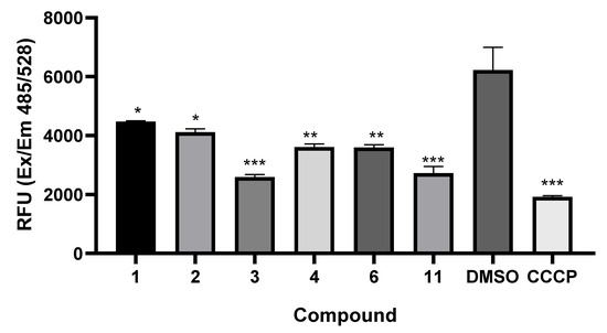 Changes in mitochondrial membrane potential caused by the compounds. Fluorometry was used to measure the mitochondrial effects of compounds that inhibited cell growth in culture. A membrane disruptor (CCCP) was added as a positive control, and untreated cultures (DMSO) were used as a negative control. All compounds were tested at 10 µg/mL for 6 h in triplicate, n = 3; * p ≤ 0.05, ** p < 0.01, *** p < 0.005.