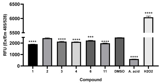 Generally, a decrease in ΔΨm is associated with the production of ROS resulting from mitochondrial destabilization. Therefore, we assayed the intracellular production of reactive oxygen species (ROS) for the selected compounds (1–4, 6, and 11) and compared the level of ROS production between treated and untreated cells.