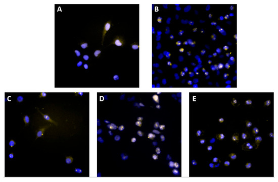 After treatment, the cells were rinsed two times with PBS, fixed in 4% paraformaldehyde (15 min), and permeabilized with 0.5% Triton X-100 (5 min). Nonspecific binding was blocked with 5% BSA in PBS for 1 h. Samples were incubated with mouse anti-active Bax (clone 6A7; 1:100 dilution in 5% BSA) overnight at 4 °C, washed 3 times with PBS, incubated with Alexa Fluor 555-conjugated secondary anti-rabbit antibody (dilution 1:500) for 2 h at room temperature in the dark, and washed 3 times with PBS. Nuclei were counterstained with Hoechst 33342 (Abcam Inc., Waltham, MA, USA) (15 min), washed 2 times with PBS, and left in PBS at 4 °C in the dark.