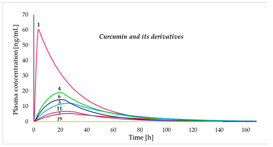 Prediction of the main pharmacokinetic parameters of curcumin and its derivatives (10 mg human oral dose) using ADMET Predictor® software.
