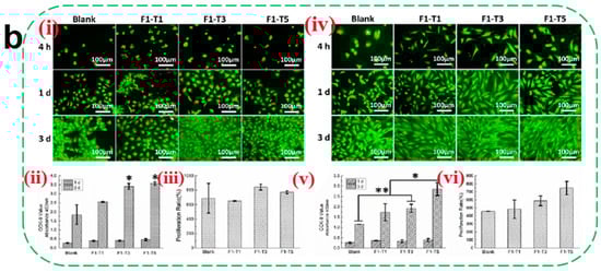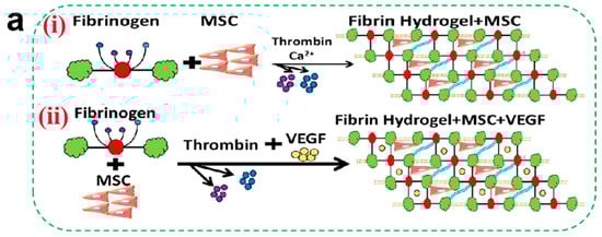 (a) (i) Schematic of encapsulated BMSCs in fibrin gels. (ii) Schematic of encapsulated VEGF and BMSCs in fibrin gels. (b) Evaluation of epithelial cell compatibility. Morphology of EC (i) and SMC (iv) of different fibrin gels; (ii,v) refers to the CCK-8 results, and (iii,vi) refer to the proliferation ratio of ECs and SMCs, respectively (mean ± SD, n ≥ 3, * p < 0.05, ** p < 0.01) [45]. Copyright 2021, Elsevier.