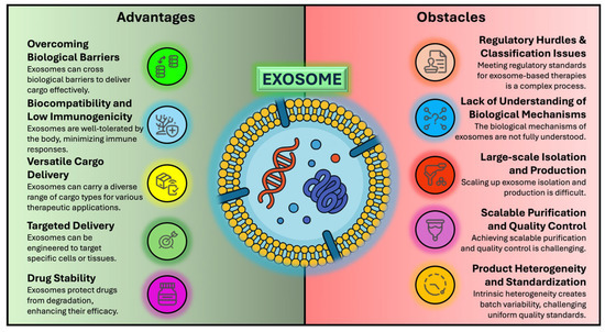 Comparative overview of the principal advantages and key challenges in exosome-based therapeutics. (Left Panel): core advantages—efficient barrier crossing, high biocompatibility and low immunogenicity, versatile cargo loading, targeted delivery, and improved stability. (Right Panel): main hurdles—regulatory ambiguity, mechanistic gaps, scale-up and purification constraints, quality control issues, and batch heterogeneity.