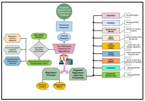 International harmonization of the EV regulatory framework presents both a significant challenge and a promising opportunity in biomedicine. The inherent complexity of EV biology means that their development and manufacturing processes encounter unique regulatory obstacles. Globally, differing regulatory approaches result in variations in how EVs are characterized and evaluated for clinical use. Wang and colleagues underscore that achieving harmonization across these practices is crucial for ensuring safety and efficacy across diverse jurisdictions Table 1 [15]. One promising strategy to advance harmonization is the establishment of international cooperation frameworks. Current discussions advocate a dual approach: one that focuses on the composition and biological effects of EV, and another that evaluates their therapeutic implications [15]. In support of this, the ISEV has called for the standardization of methodologies to assess exosome products, thereby promoting a unified regulatory approach that spans both geographical and institutional boundaries [45] Figure 3. Such collaborative efforts are essential, as inconsistent regulations can impede innovation and delay the translation of research into clinical applications. Moreover, international bodies such as the International Conference on Harmonization (ICH) play a pivotal role in aligning regulatory standards for biopharmaceuticals, including EV. Their established frameworks have fostered regulatory convergence across regions, facilitating smoother collaborative efforts in drug development and approval processes [99]. Additionally, recent initiatives emphasize sharing best practices and aligning preclinical and clinical evaluation standards to further bolster regulatory coherence in EV therapeutics [100,101]. Despite these advancements, notable challenges remain. For example, incomplete harmonization—illustrated by experiences in the stem cell sector—can lead to regulatory fragmentation, thereby compromising global assessments of efficacy and safety [102]. Furthermore, stakeholders must navigate complex ethical, legal, and social considerations as they work toward a more cohesive regulatory stance on EV [103]. Addressing these multifaceted issues necessitates an ongoing dialogue among regulatory authorities, scientists, and healthcare providers to develop robust standards that support innovation while safeguarding public health Figure 3.