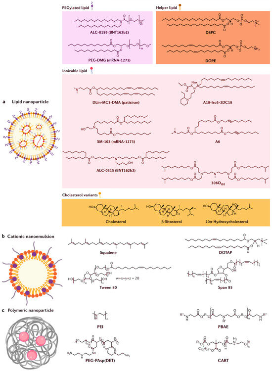 (a) mRNA is encapsulated in lipid nanoparticle, which consists of ionizable lipid, cholesterol or its variant, helper lipid, and PEGylated lipid; (b) cationic nanoemulsion contains squalene (lipid) core with an outer shell made of cationic lipid (DOTAP) and stabilized by surfactants (tween 80 and span 85); and (c) polymeric nanoparticle is formed from the complexes of mRNA–polymer (PEI, PBAE, PEG-PAsp (DET), and CART). Adapted from Chaudhary et al. [51].