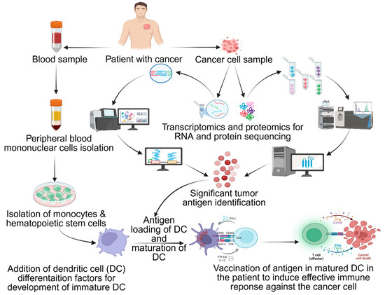 Immune response from dendritic cells (DCs): isolate PBMC, purify monocyte/hematopoietic cells, identify tumor antigen with analysis and computational models, load antigens into DCs and activate with cytokines (IL-1β/IL-6/TNF-α) or genetically engineer (CD40L/CD70/TLR4), and re-infuse mature DCs to trigger immune activation. Antigen (+) DCs stimulate CD4+/CD8+ T cells and activate NK/B cells. Adapted from Shariati et al. [151].