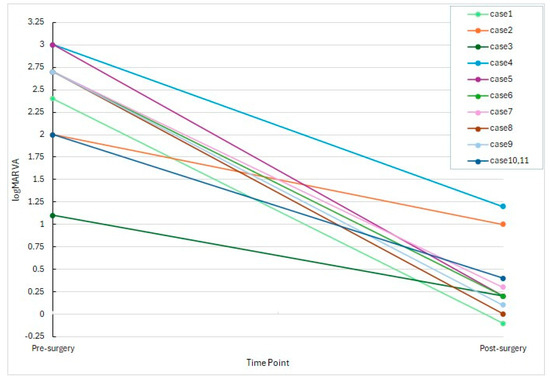As illustrated in Figure 1, most eyes demonstrated a marked reduction in logMAR values, with 8 out of 11 eyes achieving postoperative decimal visual acuity of 0.4 or better.