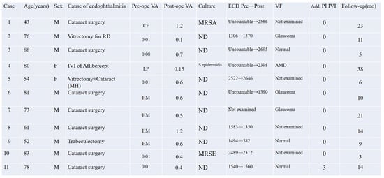 Clinical summary of 11 eyes with infectious endophthalmitis treated using intravitreal 1.25% PI and low-dose antibiotic irrigation. The table includes patient demographics, etiology, pre- and postoperative visual acuity, corneal endothelial cell density, Goldmann visual field findings, culture results, and additional intravitreal injections of PI. MH = macular hole; AMD = age-related macular degeneration; ECD = endothelial cell density; IVI = intravitreal injection; PI = povidone-iodine.