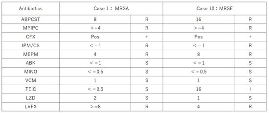 Microbiological cultures were performed in all 11 cases using vitreous and/or aqueous samples obtained at multiple time points, including before intravitreal PI injection, before the start of vitrectomy, and at the conclusion of surgery. Positive culture results were identified in three cases (27.3%): methicillin-resistant Staphylococcus aureus (MRSA) in Case 1, methicillin-resistant Staphylococcus epidermidis (MRSE) in Case 10, and Staphylococcus epidermidis in Case 4. All other cases yielded negative culture results despite clinical features consistent with infectious endophthalmitis. No fungal or polymicrobial infections were detected in this series. These results are summarized in Figure 2. The antibiotic resistance profiles of the MRSA and MRSE isolates are shown in Figure 3.