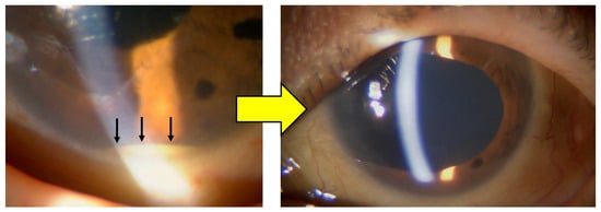 Clinical course of Case 11, which required additional intravitreal injections of 1.25% PI. The left image shows anterior chamber hypopyon (arrow), indicating active intraocular inflammation at presentation. The right image demonstrates the resolution of endophthalmitis following treatment. The eye is aphakic due to prior intraocular lens explantation performed at another facility following two unsuccessful vitrectomies for post-cataract endophthalmitis. Complete resolution of inflammation was achieved without adverse events, and visual acuity improved from 0.01 to 0.4.