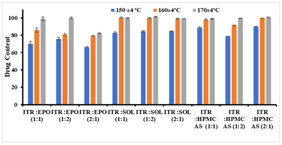 The effects of changes in the above parameters, such as homogeneity, content uniformity, and drug content, on the formulation properties were thoroughly studied. Compared with 150 °C, temperatures between 160 °C and 170 °C during the extrusion process yielded better drug contents and enhanced physical and chemical uniformity. This improvement may be attributed to the increased fluidization of the polymer chains at elevated temperatures, which facilitates better mixing and melting, thereby enhancing the homogeneity and drug distribution [58,59]. For the ITR EPO and ITR AQOAT® AS-HG solid dispersions, the optimal drug content was observed at 170 °C, and for the ITR SOL solid dispersions, the optimal drug content was observed at 160 °C (Figure 1). Thus, temperature was identified to play a crucial role in the development of ITR ASDs. After the processing temperatures (170 °C for Eudragit® EPO ASDs, 160 °C for Soluplus® ASDs and 170 °C for AQOAT® AS-HG ASDs) were fixed, different screw speeds were evaluated. No major effect of the screw speed on the product performance characteristics was observed.