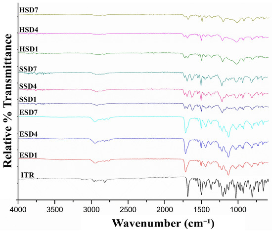 FTIR spectroscopy was employed to investigate possible drug–polymer interactions in the amorphous solid dispersions (Figure 2). Pure itraconazole exhibited characteristic vibrational bands at 1708 cm−1 (C=O stretching) [61], 1514 cm−1 (C=N stretching) [62], and 1140–1250 cm−1 (C–O–C stretching) [63,64,65]. In the ASD formulations, these bands showed noticeable shifts and/or broadening, particularly in the carbonyl and amine regions, indicating the formation of hydrogen bonding or other intermolecular interactions between the drug and polymer matrix, crucial for the formation of amorphous products.