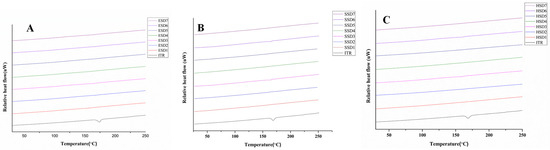 DSC spectra of optimized ASDs (A–C); ITR EPO ASDs (A), ITR SOL ASDs (B), and ITR AQOAT® AS-HG ASDs (C).