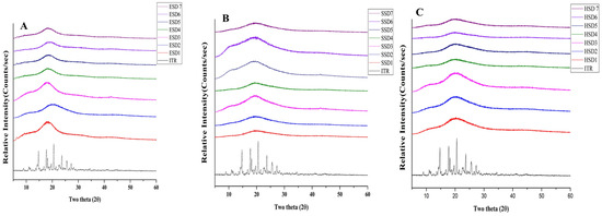 PXRD spectra of optimized ASDs: ITR EPO ASDs (A), ITR SOL ASDs (B), and ITR HPMC AS ASDs (C).