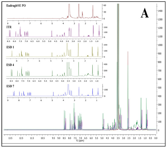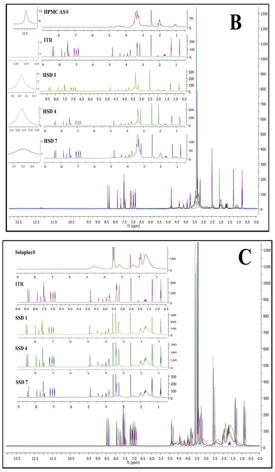One of the straightforward experimental approaches currently used to characterize novel ASDs includes 1H NMR. Chemical shielding interactions have been demonstrated to be very sensitive to drug–polymer interactions and subtle changes in the local electronic environment, indicating the occurrence of API-polymer interactions in ASDs [50,51,52]. Figure 5 represents NMR spectra of ITR EPO ASDs (A), ITR SOL ASDs (B), and ITR HPMC HG ASDs (C).