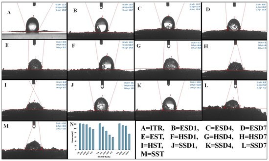 The contact angle is an often-used approach for assessing the wettability of a surface or substance, which is related to the deposition of liquid on a solid substrate and its capacity for forming boundary interfaces with it [48,49,50]. The contact angle measurements of the API and optimized ITR ASDs were conducted via the sessile drop methodology with the half-angle fitting method, which employs an APEX contact angle meter (ACAM NSC Series) with an angular accuracy of ±0.05°. The powder samples were positioned on a level surface affixed with double-sided adhesive tape. A drop of distilled water was applied to the sample via a syringe positioned 0.5 cm above it. Contact angle measurements were conducted in triplicate within 10 ± 3 s.