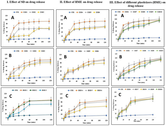 The current study aimed to investigate the physicochemical characteristics of ITZ-ASDs formulations with different polymeric carriers. The key objective of the present study was to design, develop, and compare both SD and HME continuous processing strategies for amorphous solid dispersions of ITZ and to further explore the impact of polymer selection and manufacturing techniques on the dissolution of ITZ.