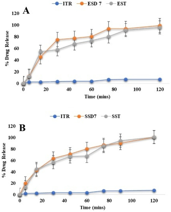 In ITR EPO ASDs, the 1H NMR signals were observed to shift downfield compared with the signals present in the polymer and ITR individually. Additionally, one crucial finding was observed: a peak near 2.25 ppm from the polymer Eudragit EPO was nearly suppressed in ITR EPO-loaded ASDs. These observations may be attributed to the potential hydrogen bonding interaction between the ITR and the latter [70,71,72]. The intensities of the proton signals in ESD7 were diminished due to the inclusion of the plasticizer propylene glycol, possibly improving the binding interactions relative to those in ESD4. Similar to ITR EPO ASDs, a downfield shift in the chemical signals was observed for the ITR Soluplus®-loaded ASDs in comparison with the ITR and the Soluplus® polymer.