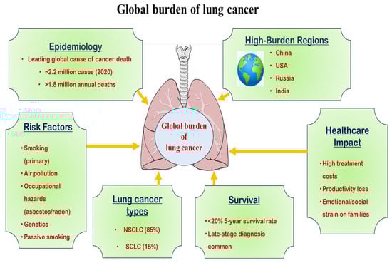 Lung cancer continues to be the most fatal cancer globally, accounting for approximately 1.8 million deaths in 2020, alongside 2.2 million newly diagnosed cases [1,2]. Regions such as Europe, Eastern Asia, and Southeast Asia report the highest prevalence, with the use of tobacco identified as the key risk factor, contributing to nearly 85% of all cases [3]. However, non-smoking-related lung cancer, often linked to genetic mutations (e.g., epidermal growth factor receptor (EGFR), anaplastic lymphoma kinase [4] receptors) and environmental exposures (e.g., radon, air pollution), accounts for 10–25% of cases globally [5,6,7,8,9].
