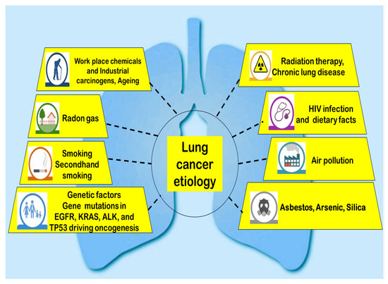 Lung cancer arises from a complicated interaction of behavioral, environmental, and genetic factors. Tobacco smoking remains the primary cause, contributing to 80–90% of cases, with carcinogens like polycyclic aromatic hydrocarbons and nitrosamines inducing DNA mutations [1]. However, 15–20% of lung cancers occur in people who do not have a smoking habit, with risk factors including radon gas, secondhand smoke, air pollution (e.g., PM2.5), and occupational exposures (asbestos, arsenic, silica) [13] (Figure 2).