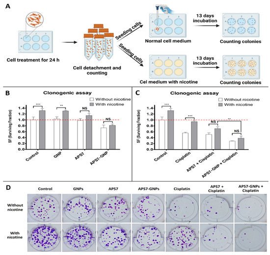 Figure 3. Effects of APS7-GNPs and cisplatin on colony formation of A549 lung cancer cells in normal and nicotine-containing conditions. (A) Schematic illustration of the clonogenic assay procedure. Cells were treated with gold nanoparticles (GNPs), APS7, APS7-GNPs, or cisplatin for 24 h, with or without nicotine, followed by seeding and incubation for 13 days before colony counting. (B) Quantitative analysis showing that APS7-GNPs significantly reduced colony formation compared to GNPs or APS7 alone, especially under nicotine exposure. (C) Combination of APS7-GNPs with cisplatin further reduced surviving fraction (SF), even in nicotine-containing medium. (D) Representative images of colony formation under each treatment condition. ** equals p < 0.01; *** equals p < 0.001; NS equals p > 0.05—not significant; ANOVA with Bonferroni’s post test). Data from [124], published by Elsevier, 2024.