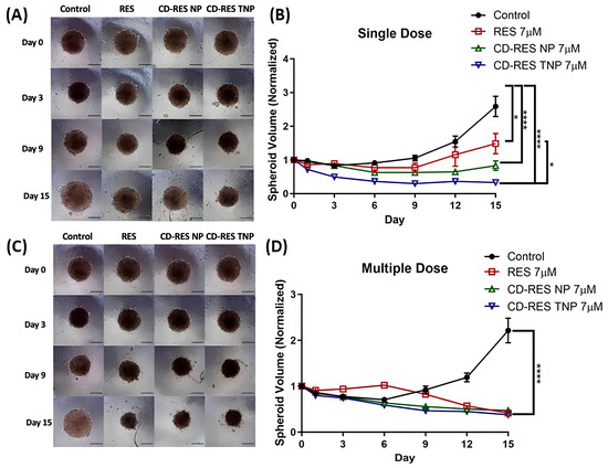 Figure 4. Three-dimensional spheroid assay evaluating the impact of treatments on H1299 tumor spheroid growth. (A) Representative images from a single dose. (B) Quantitative analysis of spheroid volume, normalized to day 0, for the single-dose group over 15 days. (C) Multiple-dose experiments captured at 10× magnification on days 0, 3, 9, and 15 (scale bar = 500 μm). (D) Volume quantification for multiple-dose spheroids during the same period. Significance between groups was analyzed by one-way ANOVA and Tukey’s multiple comparisons test. * p < 0.05 and **** p < 0.0001. Reproduced with permission from Xuechun Wang et al., Journal of Drug Delivery Science and Technology; published by Elsevier, 2025 [127].