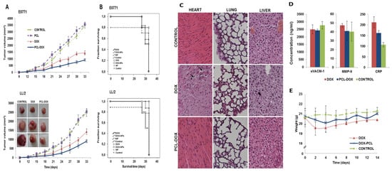 Figure 5. (A) Tumor volume progression in C57BL/6 mice with subcutaneous tumors derived from E0771 breast cancer and LL/2 lung cancer cells is shown after intravenous treatment with DOX-loaded PCL NPs, free DOX, and blank PCL NPs. Tumor growth inhibition is graphically presented as mean ± S.D. (n = 10), with representative images of LL/2 tumors. (B) Kaplan–Meier survival curves depict the survival outcomes of mice following the same treatments. Statistical differences between groups were analyzed using the log-rank test (n = 10). (C) Hematoxylin and eosin staining of heart, liver, and lung tissues reveals cardiotoxic effects in mice treated with free DOX. (D) Blood biomarkers of cardiovascular injury show elevated CRP levels in the free DOX group. (E) Body weight trends over 14 days post-treatment show weight loss in mice given free DOX. Reproduced with permission from Laura Cabeza et al., European Journal of Pharmaceutical Sciences; published by Elsevier, 2017 [131].