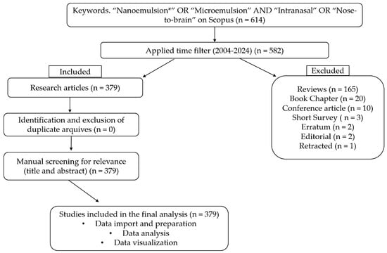 Table 1 outlines the strategy used for identifying and selecting the studies included in this analysis. The search criteria were as follows: (1) the use of the terms “Nanoemulsion OR Microemulsion” combined with “Nose-to-brain OR Intranasal” in the topic fields; (2) a publication date range from 1 January 2004, to 31 December 2024; (3) inclusion of original research articles; (4) exclusion of reviews, book chapters, retractions, letters to the editor, conference proceedings, errata, editorials, short surveys, and abstracts; and (5) removal of duplicate records if necessary. The initial search retrieved 614 publications prior to applying the time filter. After limiting the results to the defined time frame, 582 records remained. Of these, 379 were original research articles included in the final analysis. Although this study did not explicitly exclude articles unrelated to pharmaceutical nanotechnology, such as those focused on food science, environmental studies, or forensic applications, the specificity of the keywords “intranasal” and “nose-to-brain” effectively prevented the inclusion of such content. Furthermore, all retrieved records were carefully reviewed, and no articles related to food, environmental, or forensic contexts were identified, as can be verified in the Supplementary Material “Excel intranasal Scopus.” Duplicate records were identified and, if necessary, removed using the R statistical environment (version 4.3.3, manufacture, city, if any state, country) through custom programming scripts. The complete list of included publications is provided in the Supplementary Material.