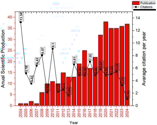 Figure 2 presents the annual scientific output (red bars) and the average number of citations per year (black line) from 2004 to 2024. The annual growth rate of publications was approximately 20.55%. A progressive increase in publication volume is observed starting in 2009, with notable peaks in 2018 and a subsequent stabilization at approximately 30 publications per year. The year 2020 recorded the highest number of publications (37), although it had a lower average citation rate (4.88). Conversely, years with fewer publications, such as 2004 and 2010, exhibited higher average citation counts (13.36 and 9.1, respectively). These findings suggest a continuous growth in publication volume, accompanied by a decline in average article impact in more recent years.