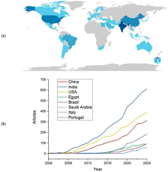 The Bibliometrix software calculated the publication frequency, indicating how much each country published about the theme during the analyzed years. The graphical interface of the Bibliometrix package, publication frequency is automatically calculated by counting the number of occurrences of each entity (such as author, country, institution, journal, or keyword) within the imported bibliographic dataset. Once the parameter of interest is selected, the software tallies how often each element appears over the analyzed period, with optional temporal filters and normalization. The results are displayed in tables and graphical formats, highlighting publication trends and enabling the identification of the most productive authors, countries with the highest publication output, the most frequent journals, and other key bibliometric indicators [,]. As shown in Figure 3a, the intensity of the blue color corresponds to the frequency of publications in each country, darker shades indicate a higher number of occurrences of publication. The specific number of articles per country will be detailed in following sections. India leads in publication volume, with 612 articles, in frequency, which is the number of occurrences of each entity (such as author, country, institution, journal, or keyword) within the imported bibliographic dataset, followed by the United States with 391, China with 315, Brazil with 187, Saudi Arabia with 95, Italy with 93, Egypt with 92, and Portugal with 54. The remaining countries each contributed fewer than 50 articles. Figure 3b further highlights the growth in scientific output across these countries.