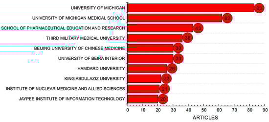 The School of Pharmaceutical Education and Research in India ranks third, with 43 publications. Other notable institutions include the Third Military Medical University in China (36 articles), Beijing University of Chinese Medicine and the University of Beira Interior in Portugal (both with 30 articles), and Hamdard University in Pakistan (26 articles). King Abdulaziz University in Saudi Arabia (22 articles), the Institute of Nuclear Medicine and Allied Sciences in India (21 articles), and the Jaypee Institute of Information Technology in India (20 articles) also rank among the most productive.