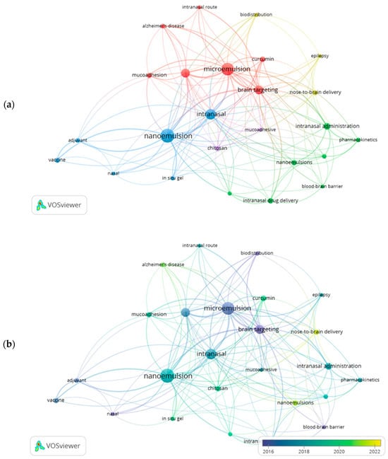 To further clarify, from the 379 articles retrieved in Scopus, 227 referred to “nanoemulsions” and 152 to “microemulsions” (see Supplementary archive of Scopus data). As illustrated in Figure 5b, “microemulsion” appears predominantly around 2016, while “nanoemulsion” and “nanoemulsions” cluster more strongly between 2018 and 2022. This distribution confirms that both terms contribute meaningfully to the field, reflecting the growing scientific interest in these technologies, even when their definitions are sometimes used interchangeably.