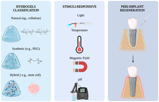 Schematic representation of hydrogel systems applied to peri-implant bone regeneration. Hydrogels can be classified into three types: natural, synthetic, and hybrid, each with unique structural and biological features. These biomaterials can be stimulus-responsive to various stimuli, including light, temperature, magnetic fields, and pH. Their application in peri-implant defects may enhance bone regeneration. Abbreviations: PEG, polyethylene glycol. Created with https://www.biorender.com/ (2 July 2025).