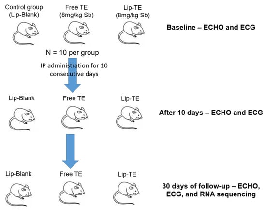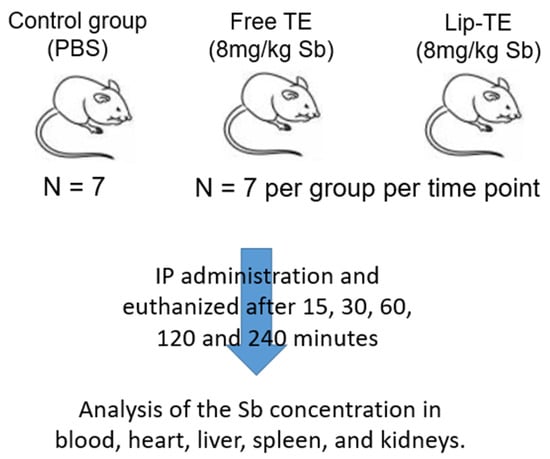 In order to evaluate the biodistribution and pharmacokinetics of the Lip-TE treatment, female BALB/c mice (8 weeks old, 18–22 g) were used. The studies were approved by the Ethics Committee on Animal Use of the Federal University of Minas Gerais (CEUA/UFMG) under protocols no 240/2018 and 49/2024. The animals were weighed prior to treatment initiation and randomly assigned to three groups (n = 7 per group per time point): PBS (control group), Free TE, and Lip-TE. The solution containing Free TE was prepared by dissolution of 67 mg of TE in 30 mL of PBS. Thus, the final concentration of the TE solution was 2.2 g/L. Each group received an intraperitoneal dose (0.2 mL) of Sb at 8 mg/kg. The animals were euthanized at predetermined time points of 15, 30, 60, 120, and 240 min post-administration, as illustrated in Figure 1.