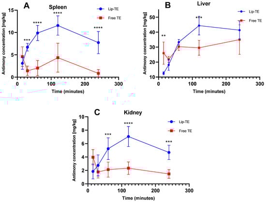 Sb concentrations in (A) spleen, (B) liver, and (C) kidney following single intraperitoneal injection of Lip-TE or Free TE (8 mg/kg Sb3+) at 15, 30, 60, 120, and 240 min. Data are mean ± standard deviation. ** p < 0.01, *** p < 0.001, **** p < 0.0001 for differences between treatments at the same time point. Shapiro–Wilk test confirmed normality. One-way ANOVA and Tukey’s post hoc test were applied. n = 7 per group per time point.