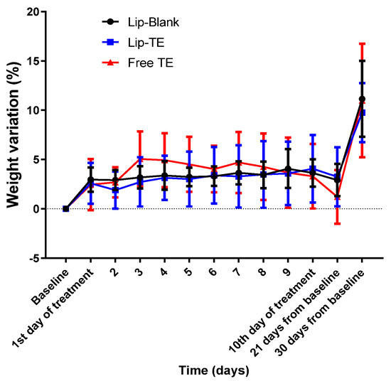 Body weight variations observed during 30 days after 10-day intraperitoneal administration of Lip-Blank (control), Lip-TE (8 mg/kg Sb), and Free TE (8 mg/kg Sb). Data are presented as mean ± standard deviation. Sample size per group: n = 10.