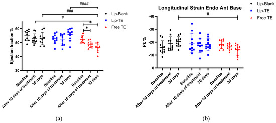Ejection fraction (%) (a), and segmental longitudinal strain (%) (b), measured after 10-day intraperitoneal administration of Lip-Blank, Lip-TE (8 mg/kg of Sb), and Free TE solutions (8 mg/kg of Sb), with 30-day follow-up. Data are expressed as mean ± standard deviation. * Indicates p < 0.05 within the same group across time points. # indicates p < 0.05, ### indicates p < 0.001, and #### indicates p < 0.0001, comparing the Lip-Blank and Lip-TE groups with the Free TE group after 10 days of treatment and 30 days of follow-up. Normality confirmed via the Shapiro–Wilk test. Two-way ANOVA followed by Tukey’s post hoc test was used. n = 10 per group.
