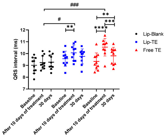 After 10 days of Free TE treatment, we observed a significant prolongation of the QRS interval, which persisted at 30 days, as shown in Figure 6. The increase in QRS duration suggests that TE may be affecting ventricular conduction pathways, possibly through structural remodeling or direct cardiotoxic effects. In the case of Lip-TE-treated mice, an increase in the QRS interval was observed after 10 days of administration, which returned to the baseline value after 30 days of injection. It is interesting to note that a statistical difference was observed between the Lip-Blank- and Lip-TE-treated groups, but it was not as pronounced as when compared with the Free TE-treated group.