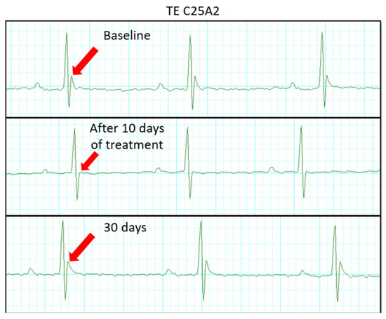 Representative ECG recordings from an animal treated with Free TE at different time points (baseline, 10 days of treatment, and 30 days). J wave signalized by red arrows.