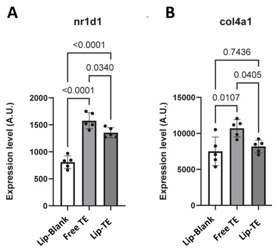 Effects of Free TE and Lip-TE treatments on gene expression levels of NR1D1 (A) and Col4a1 (B), determined by RNA sequencing. Data are presented as mean ± standard deviation (n = 5). Normality confirmed using the Shapiro–Wilk test. Statistical comparisons among groups were performed using one-way ANOVA followed by Tukey’s multiple comparisons test. p-Values < 0.05 were considered statistically significant.