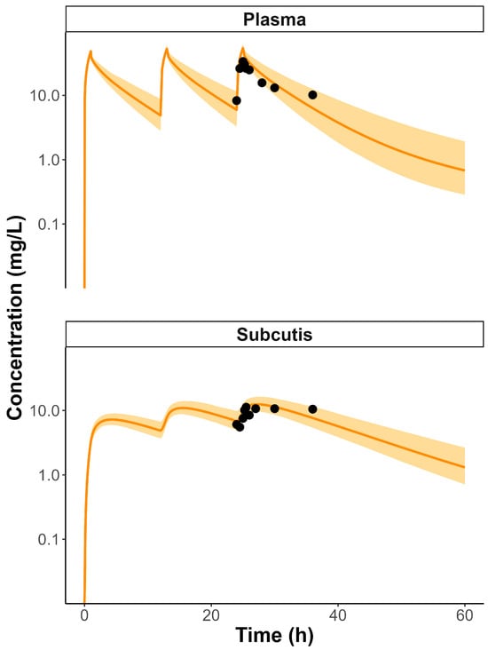 Observed and model-predicted arterial plasma and subcutaneous concentration–time profiles for septic patients. Black dots represent observations from the Abraham et al [20] study. The orange solid line shows the model prediction, and the orange-shaded area represents the 95% confidence interval of the prediction.
