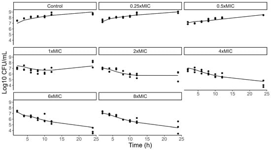 Log10 CFU/mL predicted by the PD model (continuous line) versus observed from the time-kill study raw data (black dots).