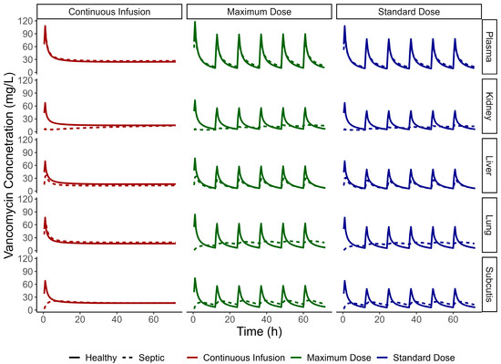 This study evaluated the response to conventional VAN therapy for MRSA (MICs of 2, 4, and 8 µg/mL) in the tissues most impacted by sepsis in patients. The model was first validated using healthy volunteers’ data then sepsis-related physiological changes in system parameters, protein binding, and renal clearance as proposed by Radke et al. [11], De Cock et al. [19], and Matzke et al. [20], respectively, were applied to simulate VAN PK. The septic population model was validated using subcutaneous ISF data from microdialysis studies. This application allowed assessment of the model’s generalizability and supported the relevance of the physiological scaling factors proposed by Radke et al. [11], together with the additional parameter adjustments from previous studies [19,20], in predicting drug distribution under septic conditions.