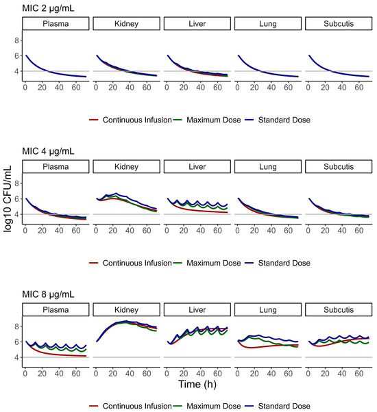 Our analysis found adequate response in all VAN regimens in patients infected with MRSA with an MIC of 2 µg/mL. However, patients that were facing MRSA with an MIC of 4 µg/mL or 8 µg/mL did not produce an adequate response in any VAN regimen. The estimated AUC and AUC0-24 values for each regimen can be found in Tables S4 and S5, respectively. Our findings contradict the consensus guidelines that recommend a VAN reference daily AUC between 400 and 600 mg.h/L. Such recommendations, however, are predicated on the assumption of an MRSA broth with an MIC of 1 µg/mL [27,28]. Consequently, it would be inappropriate to refer exclusively to these guidelines in our context, where higher MICs (4–8 µg/mL) do not match the underlying assumptions. This highlights a significant clinical challenge in managing MRSA infections with elevated MICs, suggesting that current standard VAN dosing strategies may be insufficient for achieving adequate antimicrobial exposure in these critical cases. Tissue concentrations were significantly lower than plasma concentrations which led to insufficient bacterial cell death in the kidney and liver of the patients infected with a 4 µg/mL MIC MRSA. This reduced the oscillation in VAN concentrations in these patients, which can also explain why continuous infusion performed better in most simulated conditions. This also indicates that plasma AUC should not be the sole reference for therapeutic monitoring in sepsis.