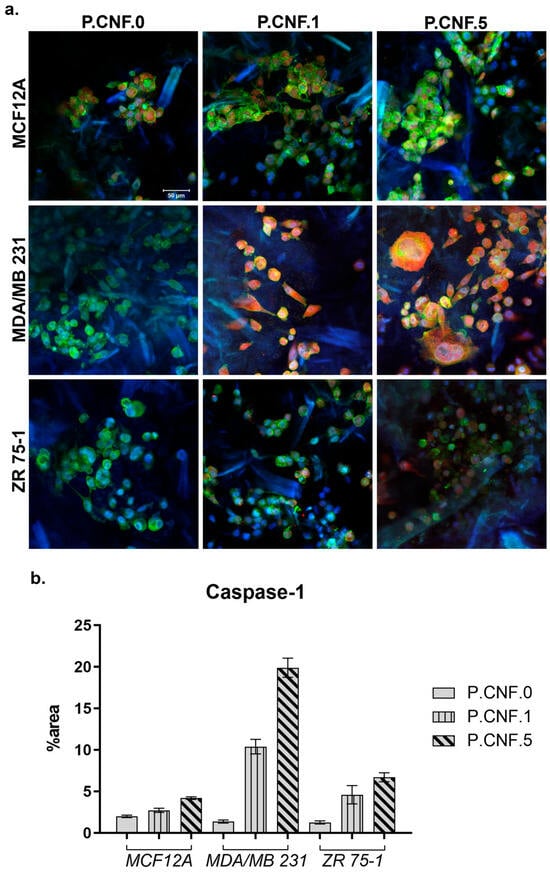 (a) Caspase-1 expression in MDA/MB 231 and ZR 75-1 breast cells, as compared to MCF12A normal breast cells, in contact with P.CNF-based scaffolds. Caspase-1 is shown in red (caspase-1-AF546), actin filaments are shown in green (phalloidin-FITC) and cell nuclei are shown in blue (Hoechst 33258). Scale bar 50 μm. (b) Quantification of caspase-1 staining.