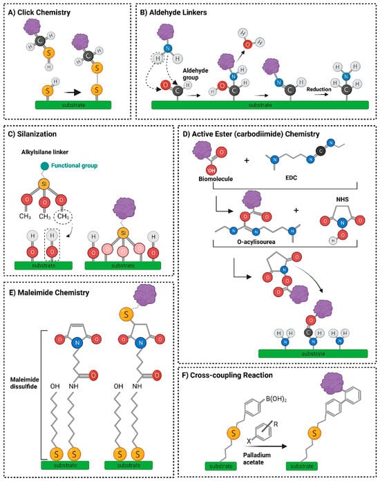 Schematic illustration of chemical reactions explored in this article: some popular surface bio-modification strategies. (A) Click reaction: Thiol functional groups engage in transient S-S bond formation, which can subsequently undergo reduction in an acidic environment. (B) The covalent binding of proteins to substrate aldehyde groups leads to the formation of transient amine linkages. A reduction reaction facilitates the creation of a covalent N-C bond. (C) Silanization: Silane linkers undergo condensation reactions with hydroxylated substrates, resulting in the formation of H3COH. (D) Active ester carbodiimide reactions: 1-Ethyl-3-(3-dimethylaminopropyl)carbodiimide (EDC) forms a C-O bond by interacting with carboxyl functional groups of biomolecules. To enhance conjugation efficiency, N-hydroxysuccinimide (NHS) is subsequently introduced. The amine functional groups of the substrate then replace NHS in the reaction. (E) Synthesis of self-assembled monolayer (SAMs) and bioconjugation using maleimide-thiol chemistry: Maleimide-terminated alkane disulfides in pure solutions are employed to prepare maleimide-terminated SAMs, facilitating bioconjugation with biomolecules containing thiol groups. (F) Functionalization of mesoporous silica gel using various organic functional groups via Suzuki coupling with aromatic halides and thiol-ene coupling of surface thiol groups with 4-vinylphenylboronic acid. Created with BioRender.com. Reprinted with permission [22]. Copyright 2023 Science Direct, Elsevier.