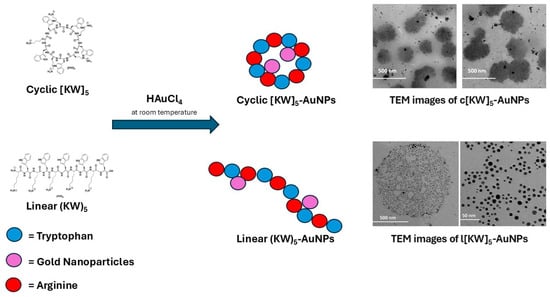 This class of peptides showed that cyclic peptides behave differently in producing and stabilizing nanoparticles, and their ability to cross the cell membrane was found to be different. TEM data showed that the morphology of linear peptide containing lysine and arginine-AuNPs is visually distinct from that of their cyclic peptide-AuNP counterpart (Figure 3).