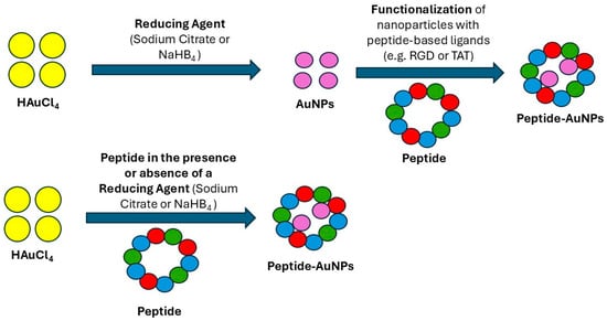 Peptides serve multiple roles in nanoparticle synthesis. Depending on their amino acid composition and sequence, peptides can act as reducing agents, nucleation templates, and capping or stabilizing agents [48,57]. Amino acids such as tyrosine, cysteine, histidine, lysine, and tryptophan play critical roles due to their redox activity and strong affinity for metal ions. For instance, through their phenolic hydroxyl groups, tyrosine residues can reduce gold ions (Au3+) to elemental gold (Au0). At the same time, cysteine provides thiol groups that tightly bind to metal surfaces, aiding in particle stabilization [58,59].
