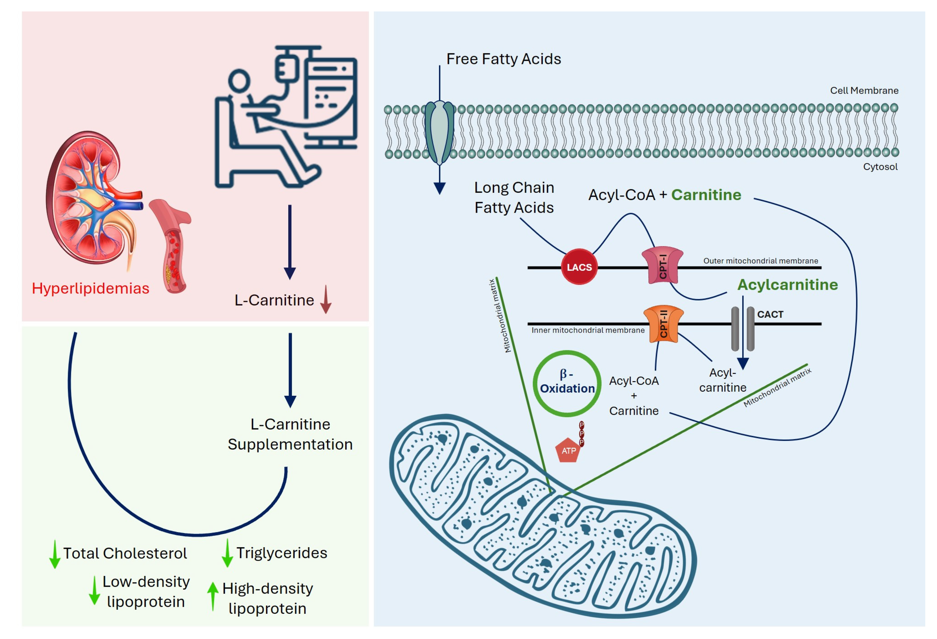 Multiple factors influence dyslipidemia in MHD patients, including the severity of renal dysfunction, dialysis duration, nutritional status, inflammation, and carnitine deficiency [1]. CKD disrupts carnitine balance through reduced endogenous synthesis and increased losses during dialysis. Dialysis-related carnitine deficiency is associated with erythropoietin-resistant anemia, intradialytic hypotension, muscle cramps, reduced exercise tolerance, cardiovascular instability, and skeletal muscle weakness [4]. Carnitine, a water-soluble quaternary amine, is essential for mitochondrial beta-oxidation of long-chain fatty acids, facilitating their transport across the inner mitochondrial membrane for energy production (Figure 1). Deficiency impairs this process, leading to lipid accumulation in circulation, while reduced hepatic and lipoprotein lipase activity in MHD patients further worsens lipid metabolism [5]. Since TC and TGs are key indicators of serum lipid status, their optimal control is crucial for reducing cardiovascular morbidity and mortality in this population [6]. Carnitine also regulates free fatty acid (FFA) availability for triglyceride synthesis, which may improve lipid profiles in deficient patients [7].